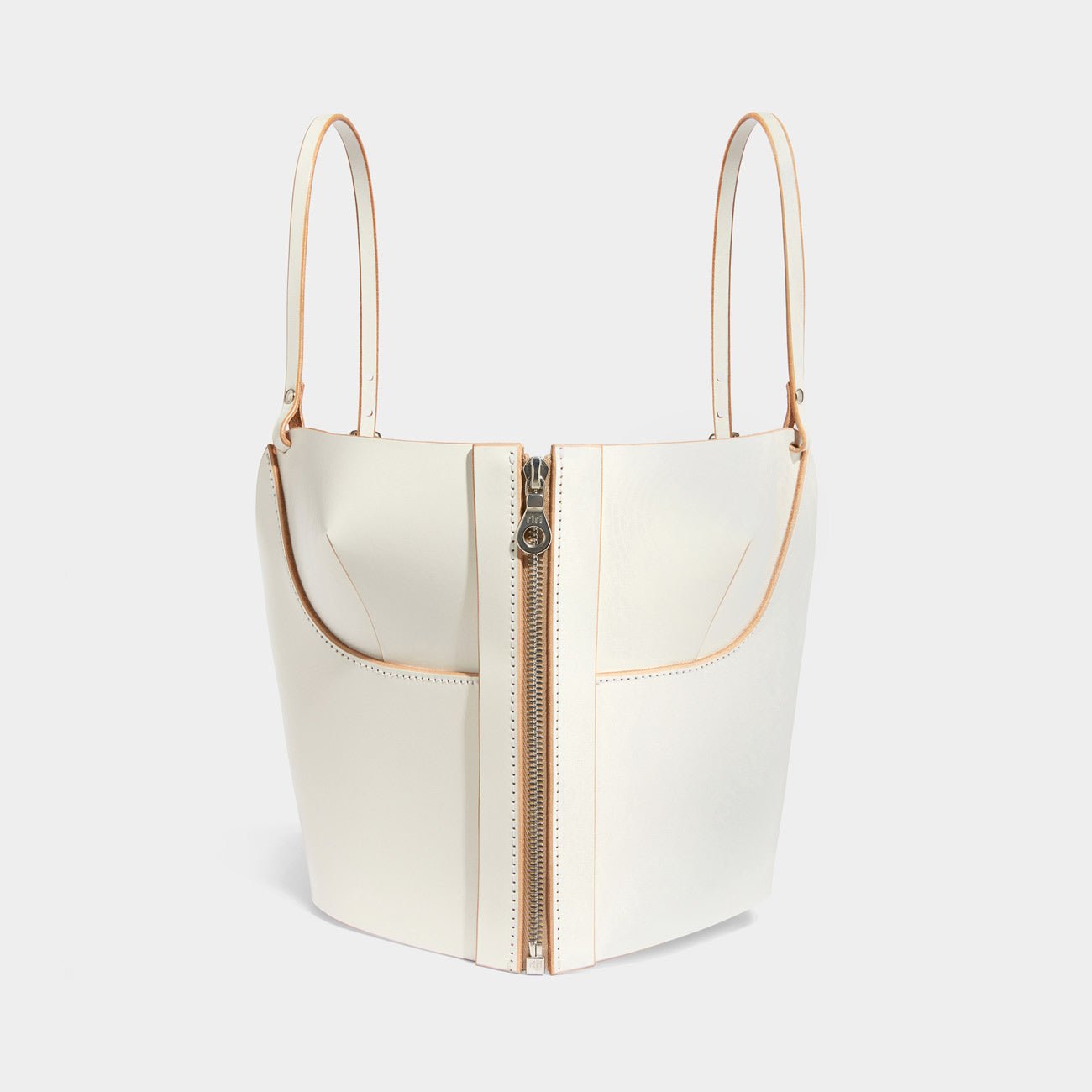 The Zip Bodice in ivory, is made with smooth saddlery leather, features elegantly folded bust details and a minimal central zip fastening. With slim shoulder straps and a double buckle fastening to the back, this piece envelopes the torso sitting just above the waist. This is a statement piece which is also a highly versatile addition to any wardrobe.