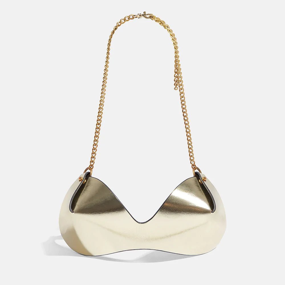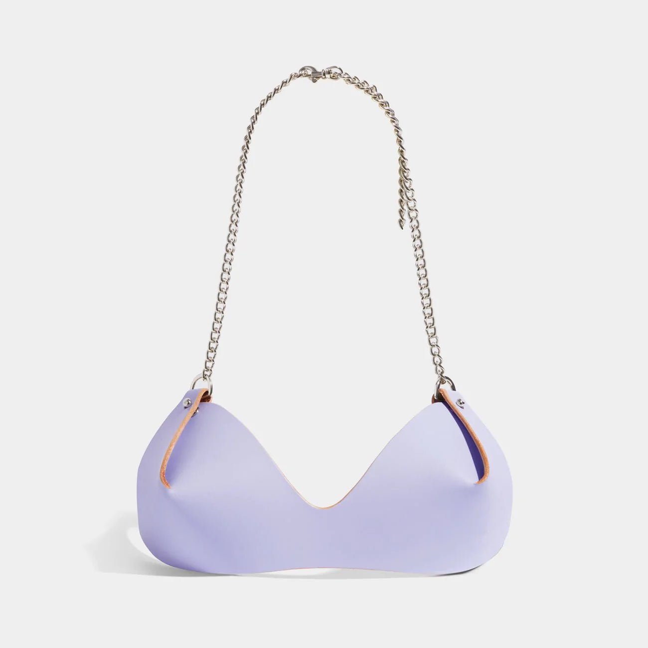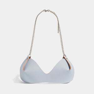 The Chain Bra fastens on the back on a slim silver chain strap and around the neck in an adjustable halter style. Its minimalist construction with folded cups, come to a point at the cup's centre, making the construction of this piece the key design detail.