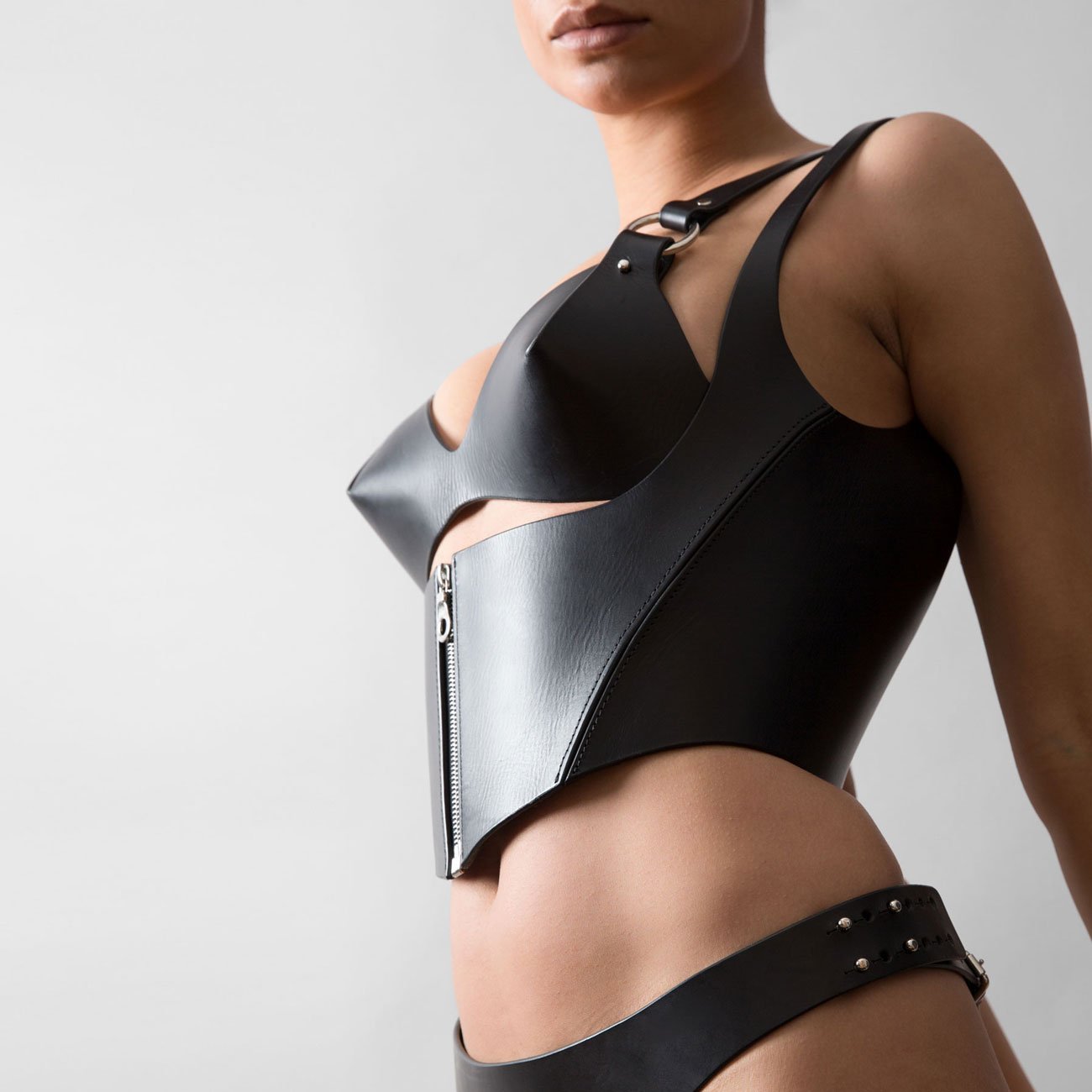 • The Zip Corset is made from smooth saddlery leather. The subtle curves of this piece make for a dramatic silhouette, this piece envelopes the torso, fitting under the bust and cinching in at the waist. The front features a minimal central zip fastening. The slim shoulder straps and triple buckle fastenings to the back make it fully adjustable to fit to your individual shape.