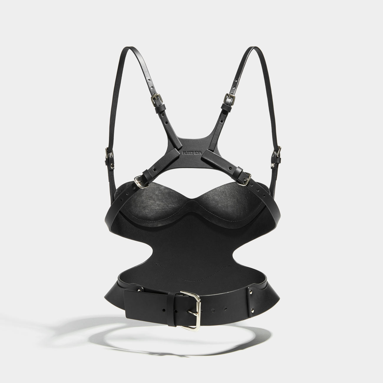 The smooth saddler leather Curved Balcony Bodice from Fleet Ilya, features minimal half cups, with small adjustable upper back straps for the perfect fit. The sculpted hip piece fastens around the waist with a single large buckle, creating a corseted look.