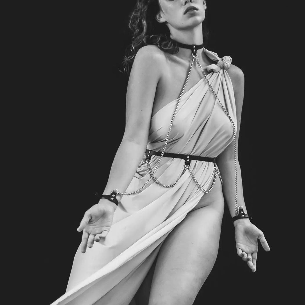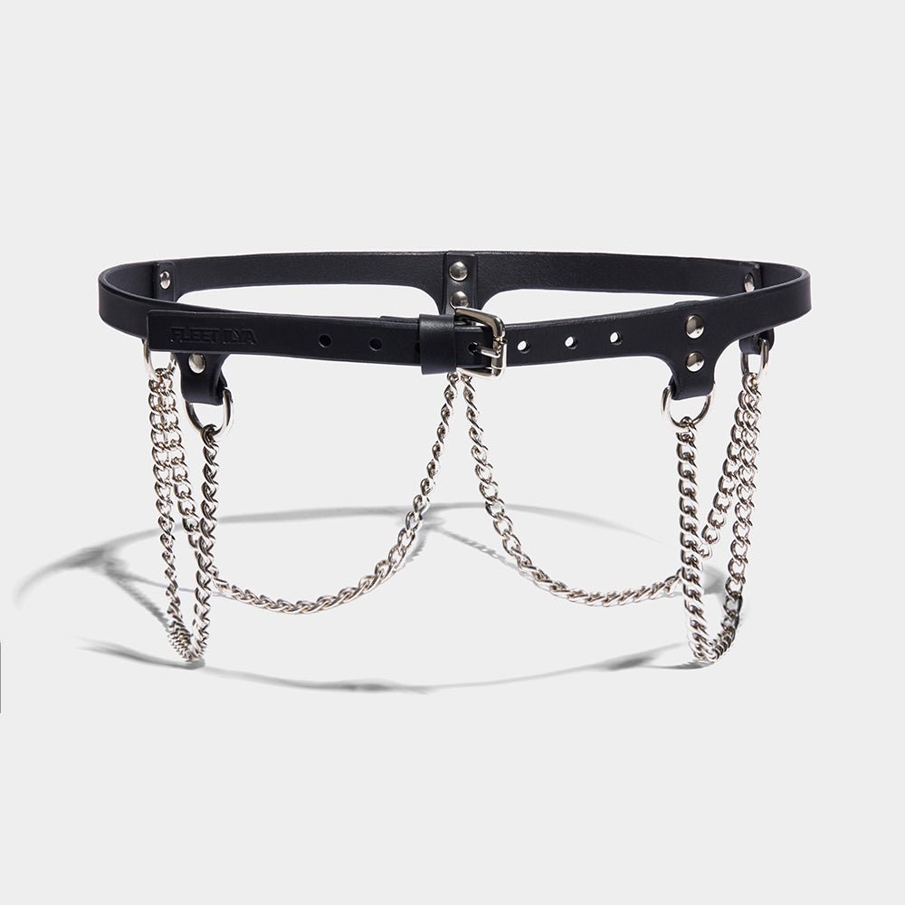 • The Slim Triple Chain Belt made from smooth saddlery leather is worn around the waist, fastening on a minimal buckle. The draped chains fall effortlessly below the waist, held by five D-rings. This belt will compliment a pair of high waist jeans or to cinch a dress.