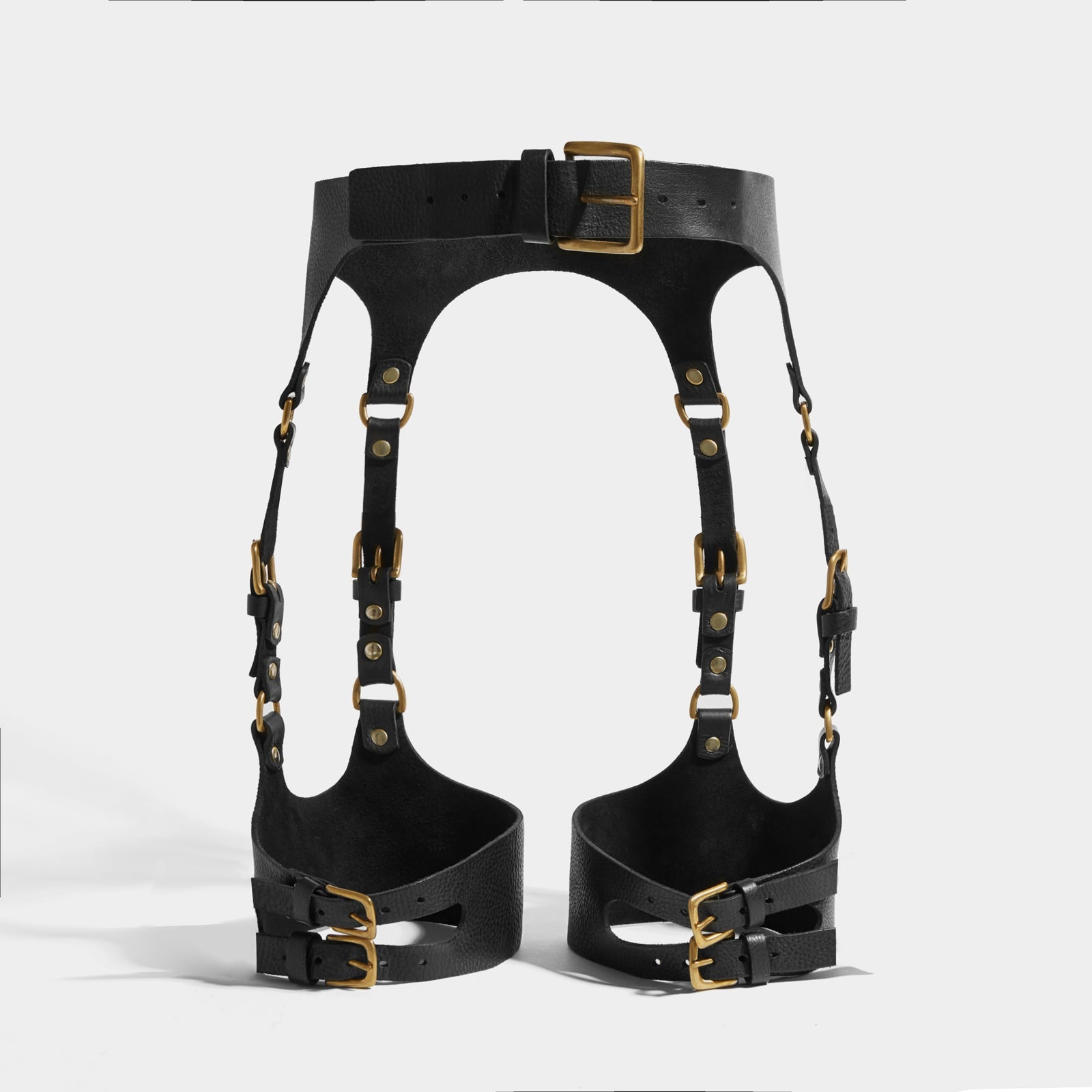 The Soft Curved Suspender Harness is made from black supple textured leather which moulds comfortably to the body, closing around the waist and thighs this piece features buckle fastenings making it fully adjustable. Elegantly contoured lines accentuate the rear and overall silhouette. Whether worn on its own or over slim fit trousers, its equestrian undertones make this is an exciting addition to any wardrobe.