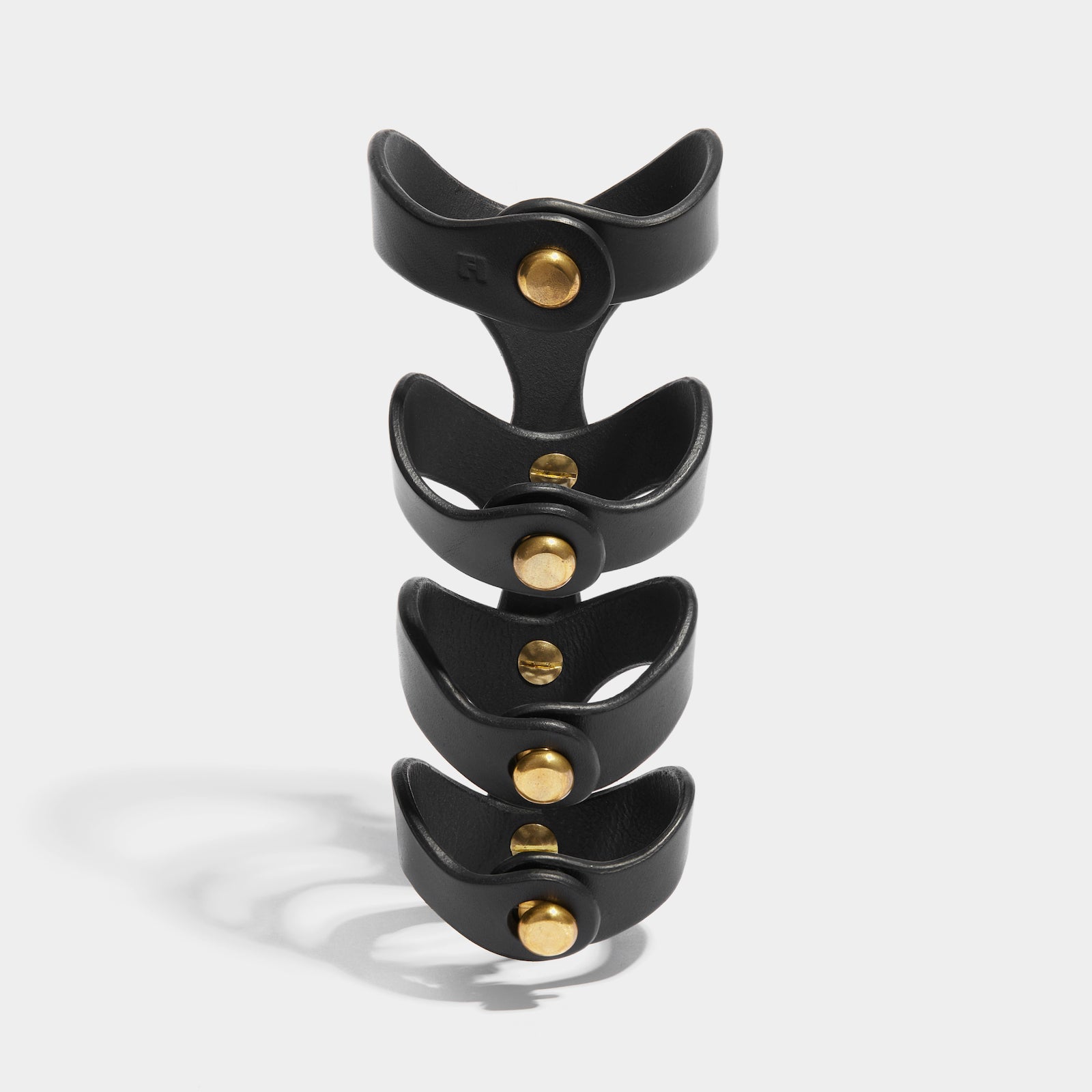 The Cage Chandelier, a hand formed lighting object, intricately constructed in smooth Black saddlery leather is bound together using traditional equestrian fittings. The outer cage coupled with the inner structure casts a unique geometric shape with the warm antique tone tubular bulb. Handmade in London, England.