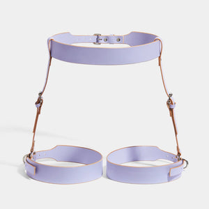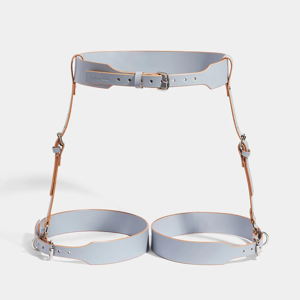 The Classic Suspender Harness fits to the body with a belt closing around the waist. The suspender straps attach to the leg straps which fasten around the upper thighs. The buckles of each part of the harness are fully adjustable to give a precise fit. Referencing our equestrian undertones, this piece frames the rear and compliments the thighs.